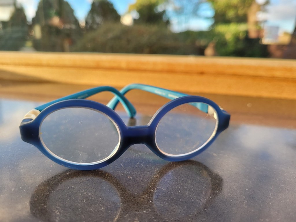 Onze driejarige een bril opzetten is als een tractor blind achterwaarts parkeren tussen twee mini’s. Met zijn te kleine neusje en die keikop van hem als extra verkeersdrempels. Dus krijgt hij twee brillen. Een gewone bril en een rollebolbril, een plooibare bril die een meteorietinslag kan overleven. Iets wat een dino niet kon, wil ik zeggen. Maar ik zwijg wijselijk.